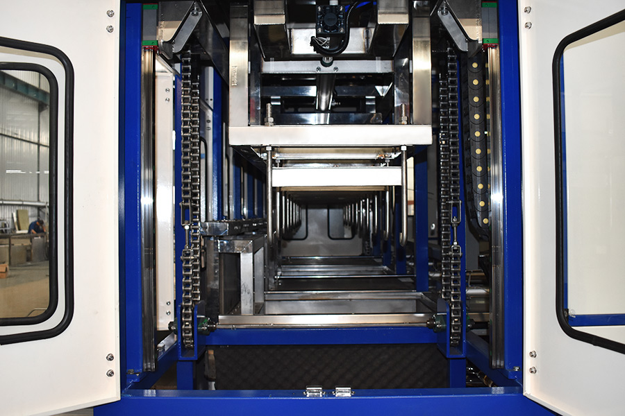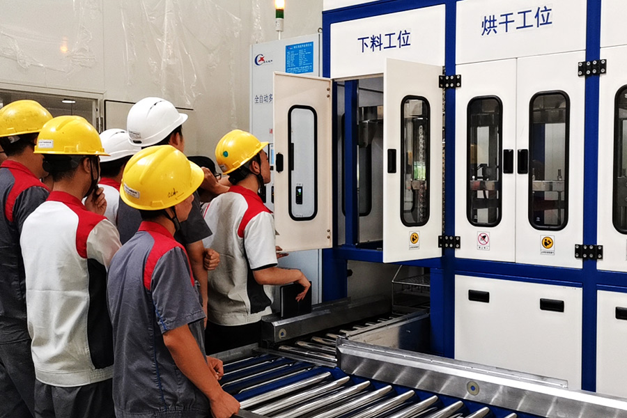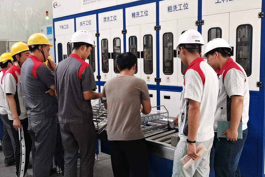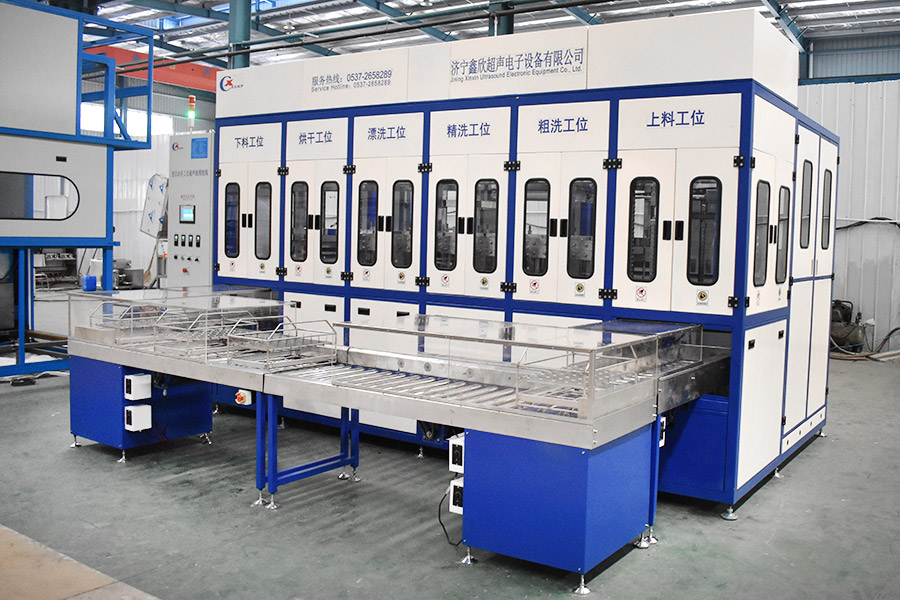 該設備有自動上下料及轉角系統、超聲波清洗系統,自動拋動、自動溢流和油污分離裝置,噴淋系統、自動高壓切水系統、自動烘干系統。機械手自動輸送系統采用高精度直線導軌配合高精度位置檢測傳感器,機械手可以準確的實現工件的抓取和放置。自動進排液和自動加溫系統完全實現了無人干預,自動運行,很大地程度上降低了工人的勞動強度。先進的霧氣處理系統可以將清洗時產生的霧氣冷凝回流,空氣經過濾和活性炭吸附后排出。