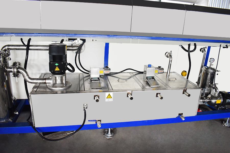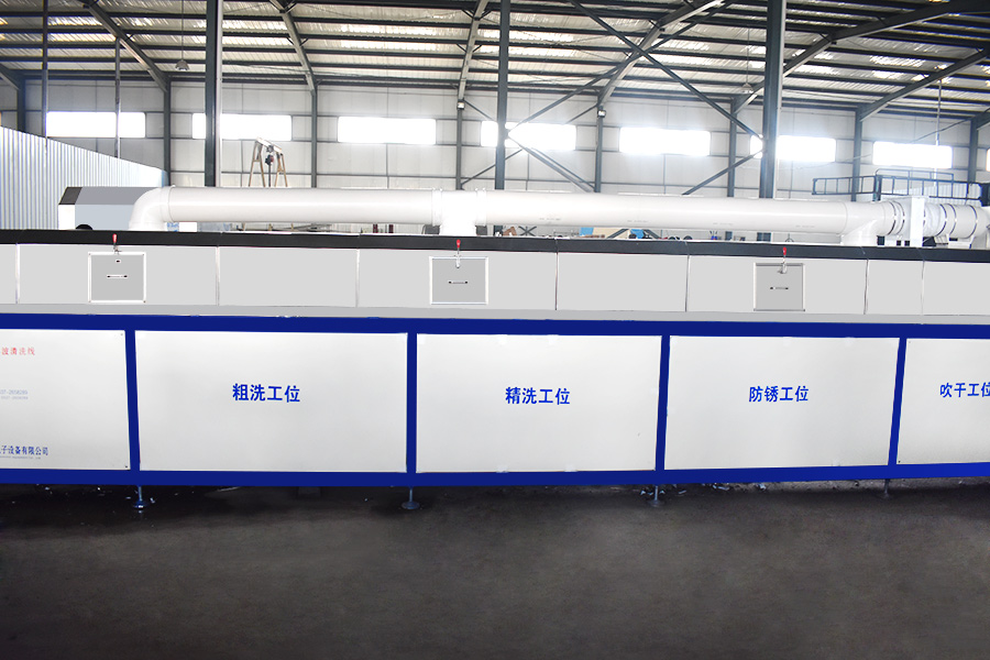 該設(shè)備有上下料網(wǎng)帶、超聲波清洗工位、噴淋漂洗工位、高壓風(fēng)切、熱風(fēng)烘干工位、溫控水加熱系統(tǒng)、風(fēng)機、溫控空氣加熱系統(tǒng)、移動式風(fēng)刀、PLC+觸摸屏控制系統(tǒng)、管路系統(tǒng)及智能電器控制系統(tǒng)等組成。自動進排液和自動加溫系統(tǒng)完全實現(xiàn)了無人干預(yù),自動運行,很大程度上降低了工人的勞動強度。先進的霧氣處理系統(tǒng)可以將清洗時產(chǎn)生的霧氣冷凝回流,空氣經(jīng)過濾和活性炭吸附后排出。