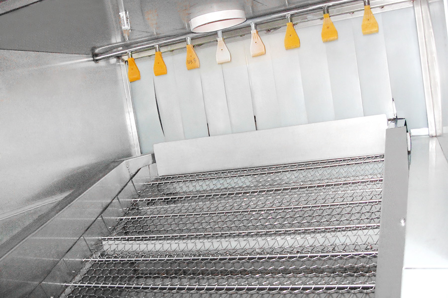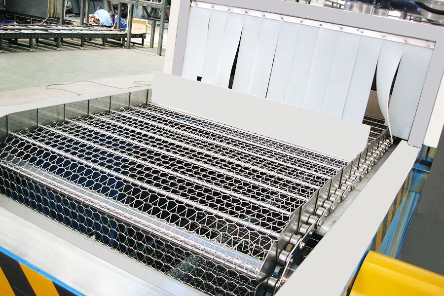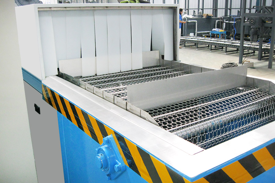 該設備有上下料網帶、超聲波清洗工位、噴淋漂洗工位、高壓風切、熱風烘干工位、溫控水加熱系統、風機、溫控空氣加熱系統、移動式風刀、PLC+觸摸屏控制系統、管路系統及智能電器控制系統等組成。自動進排液和自動加溫系統完全實現了無人干預,自動運行,很大程度上降低了工人的勞動強度。先進的霧氣處理系統可以將清洗時產生的霧氣冷凝回流,空氣經過濾和活性炭吸附后排出。