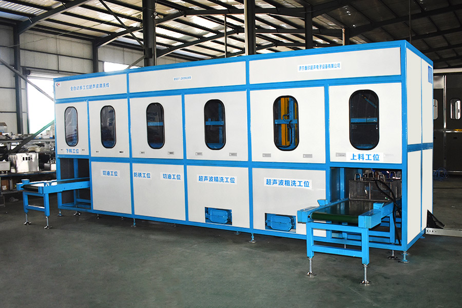 該設備有自動上下料及轉角系統、超聲波清洗系統,自動拋動、自動溢流和油污分離裝置,噴淋系統、自動高壓切水系統、自動烘干系統。機械手自動輸送系統采用高精度直線導軌配合高精度位置檢測傳感器,機械手可以準確的實現工件的抓取和放置。自動進排液和自動加溫系統完全實現了無人干預,自動運行,很大程度上降低了工人的勞動強度。先進的霧氣處理系統可以將清洗時產生的霧氣冷凝回流,空氣經過濾和活性炭吸附后排出。